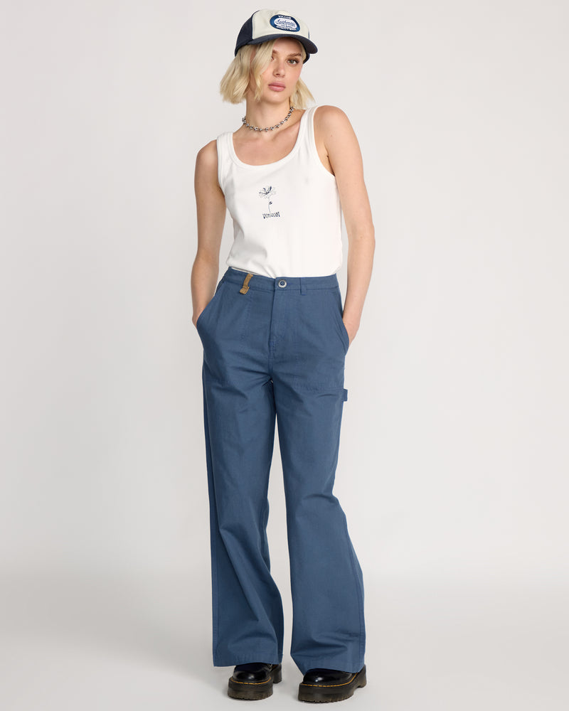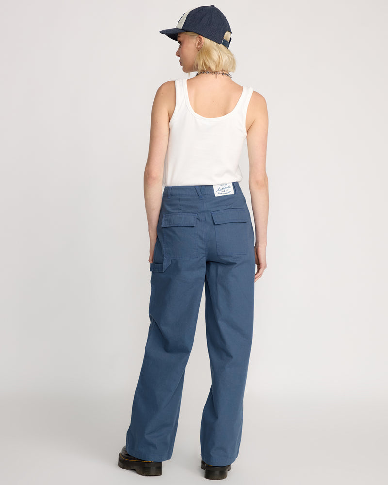 This full cut work pant rocks a relaxed fit in Harbor Blue, built from rugged 100% cotton canvas with side entry and back cargo pockets. Contrast corduroy belt loop, contrast stitching, and a workwear patch bring the goods, while Stone embroidery backs you up. 31-inch inseam. Ready for whatever.